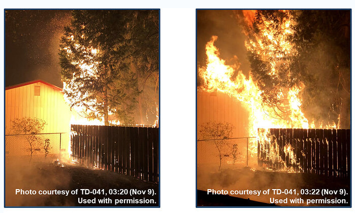 Worse than causing structure ignition remotely through their own embers, fences can actually directly ignite structures on their own. Even further than 5 ft away, combustible fences provide enough combustion heat to ignite a structure. The following two images from the 2018 Camp Fire, two minutes apart, show a fence, 6 ft away from a structure, igniting it through combustion heat: