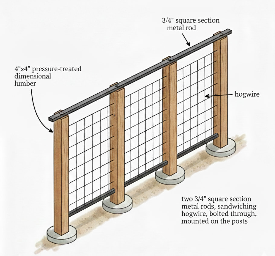- The hogwire, at its base, is stiffened and sandwiched by two rods, similar to the top rod described above, that are bolted through;