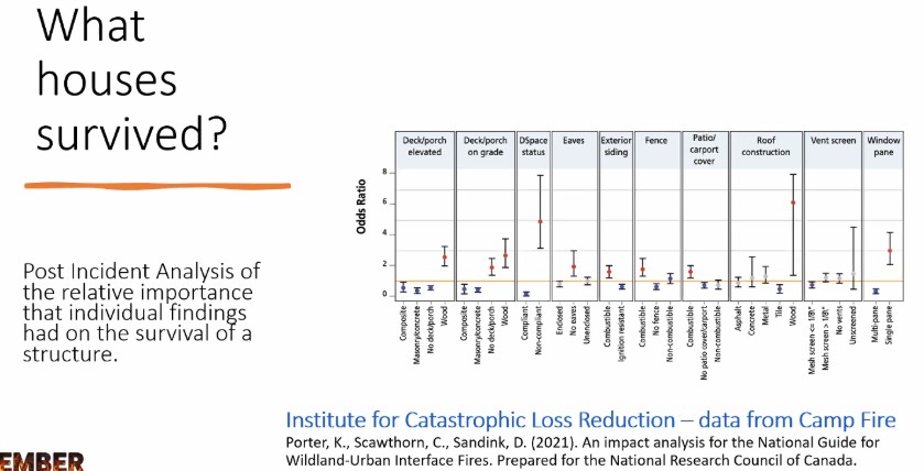 There is extensive wildfire research that statistically analyzes the different factors correlated with ignition or survival of a structure in a wildfire.